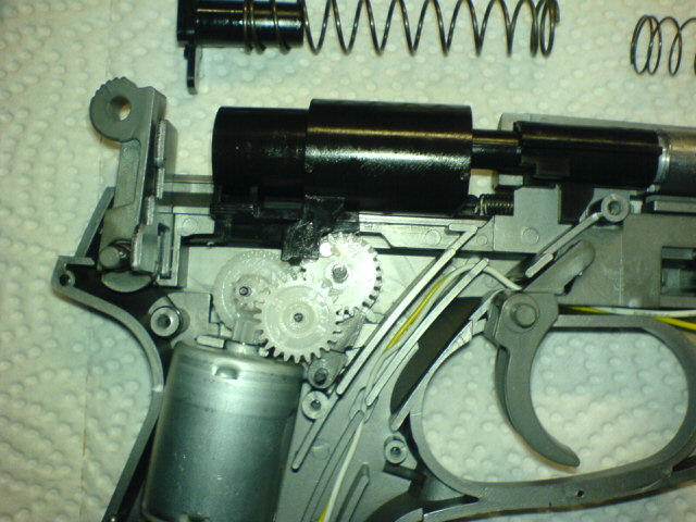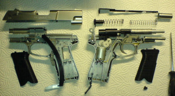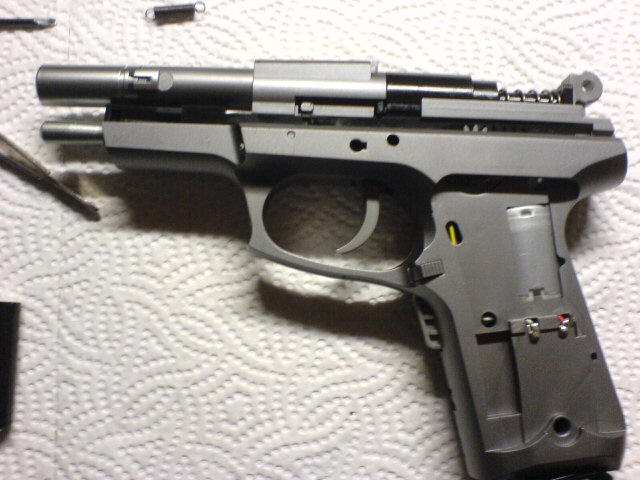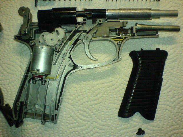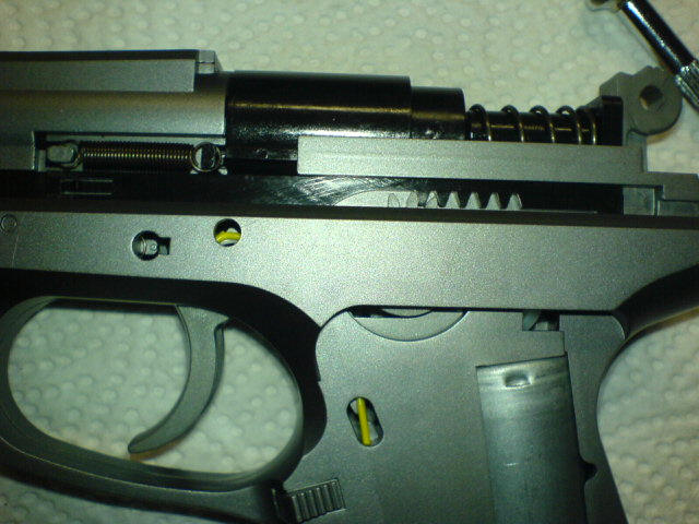 Schlitten wie beim Rückschlag einer echten Waffe, nach hinten bewegt. Dafür muss